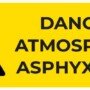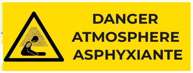 Signalétique : Texte explicite “Danger atmosphère asphyxiante” + pictogramme normalisé (triangle jaune avec symbole de gaz ou mort)