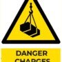 Signalétique : Texte “Danger charges suspendues” + pictogramme normalisé (triangle jaune avec charge levée par un palan)