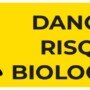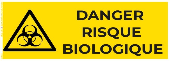 Signalétique : Texte explicite “Danger risque biologique” + pictogramme normalisé (triangle jaune avec symbole biohazard)