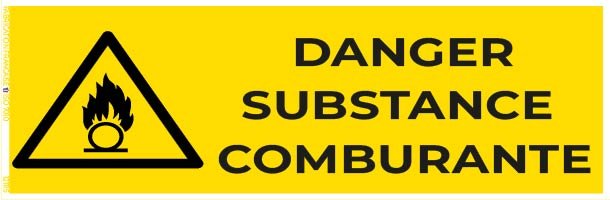 Signalétique : Texte explicite “Danger substance comburante” + pictogramme normalisé (triangle jaune avec flamme sur cercle)