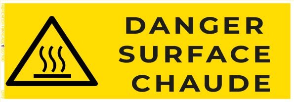 Signalétique : Texte explicite “Danger surface chaude” + pictogramme normalisé (triangle jaune avec symbole chaleur)