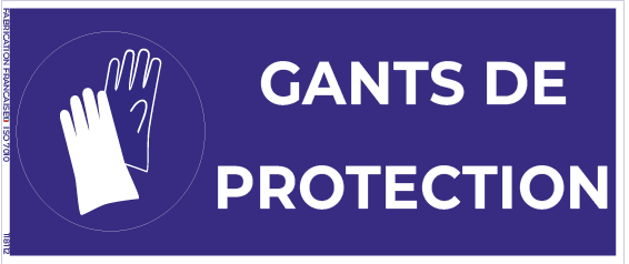 Signalétique : Texte “Gants de protection obligatoires” + pictogramme normalisé (rond bleu avec gants)