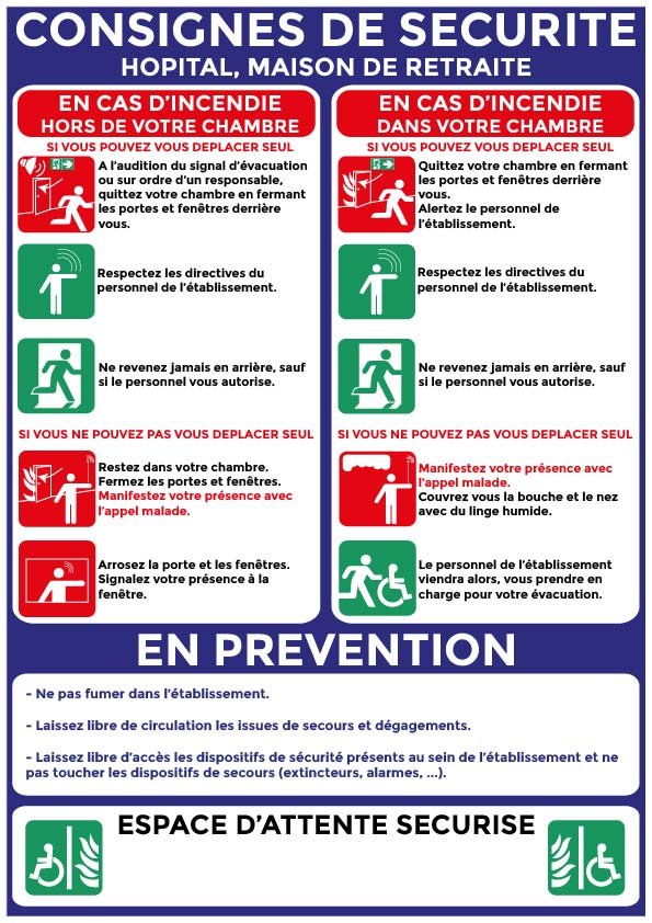 Ce panneau identifie les zones sûres de rassemblement pour le personnel, les patients et les résidents en cas d’urgence (incendie, alerte gaz, évacuation, etc.).