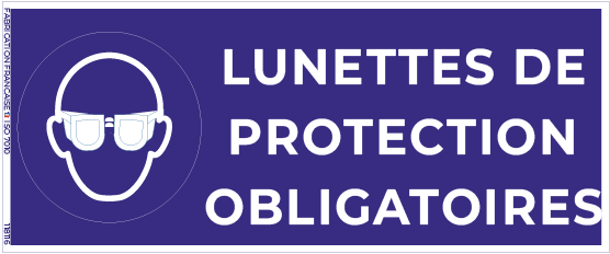 • Signalétique : Texte “Lunettes de protection obligatoires” + pictogramme normalisé (rond bleu avec lunettes de sécurité)