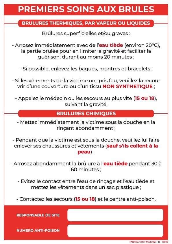 Ce panneau rappelle les gestes essentiels à effectuer immédiatement en cas de brûlure pour limiter les dommages et soulager la victime.
