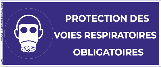 • Signalétique : Texte “Protection des voies respiratoires obligatoire” + pictogramme normalisé (rond bleu avec masque respiratoire)